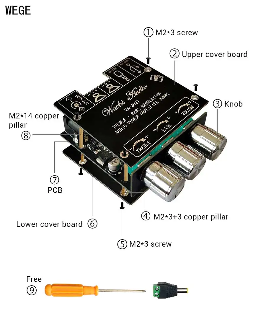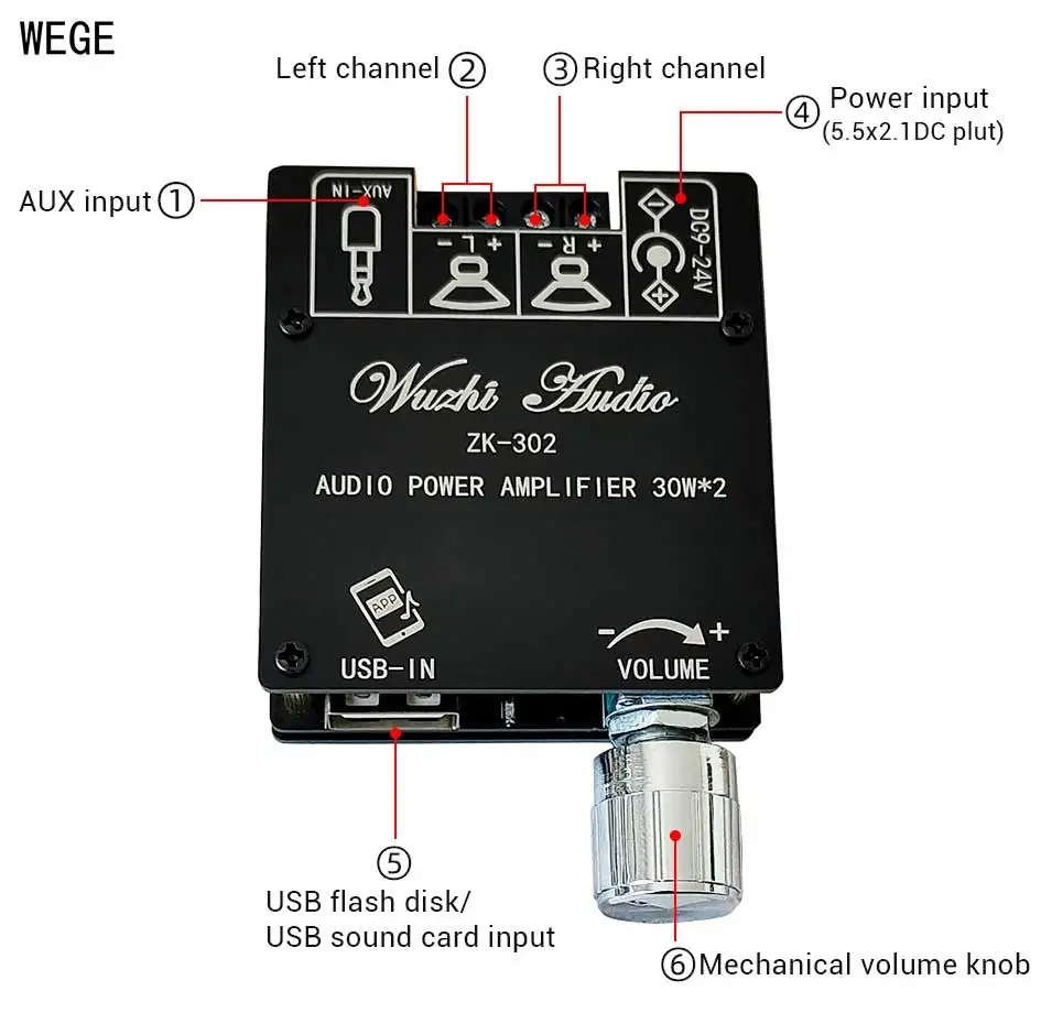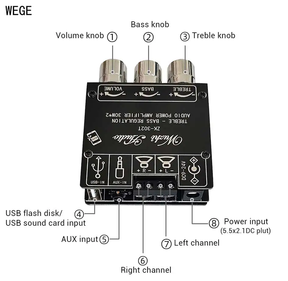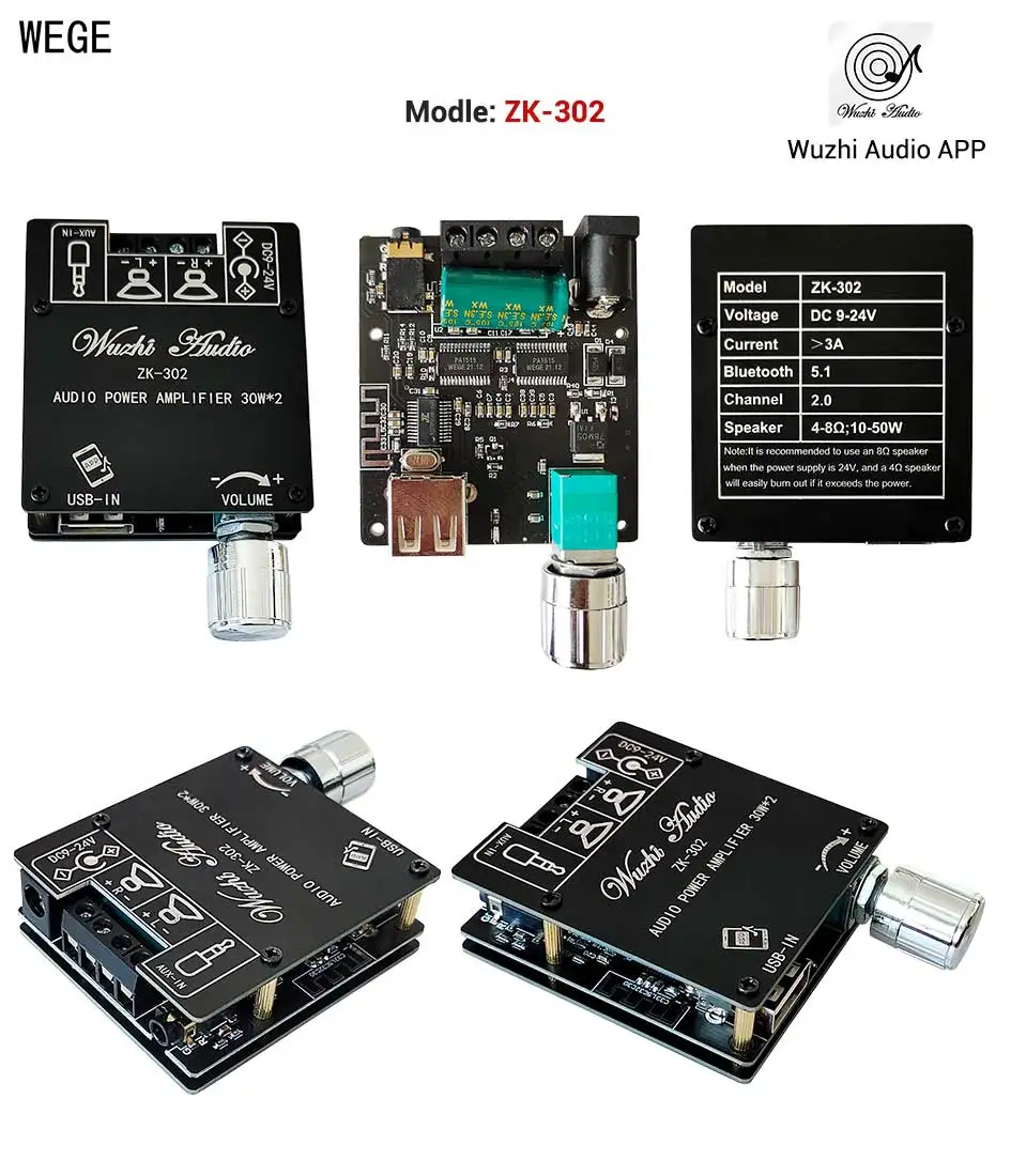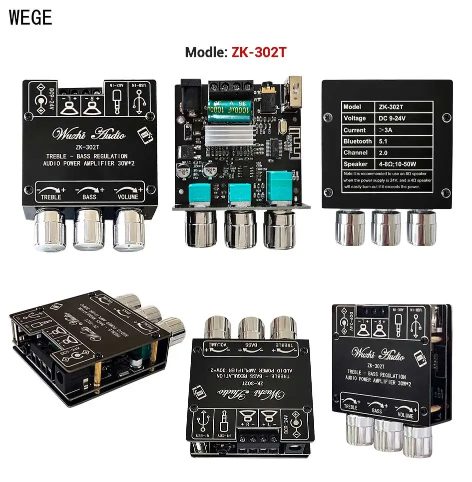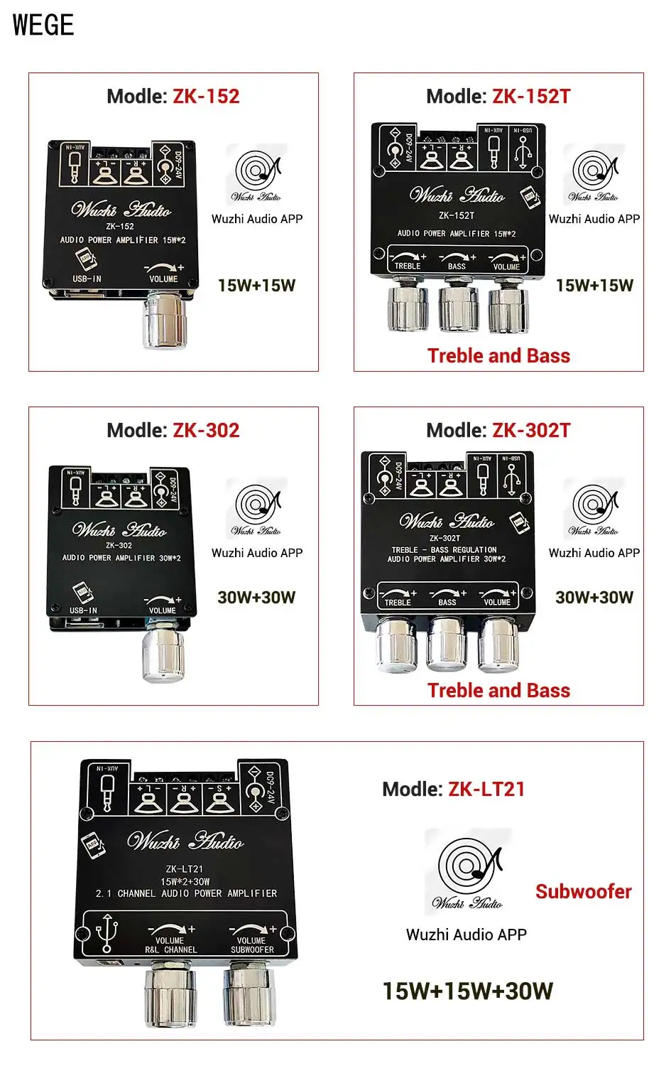 ZK-302T is 30W+30W stereo output with treble and bass adjustment.