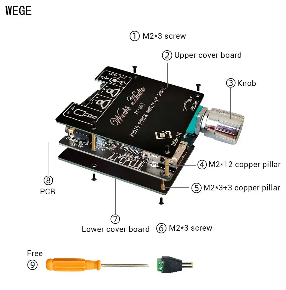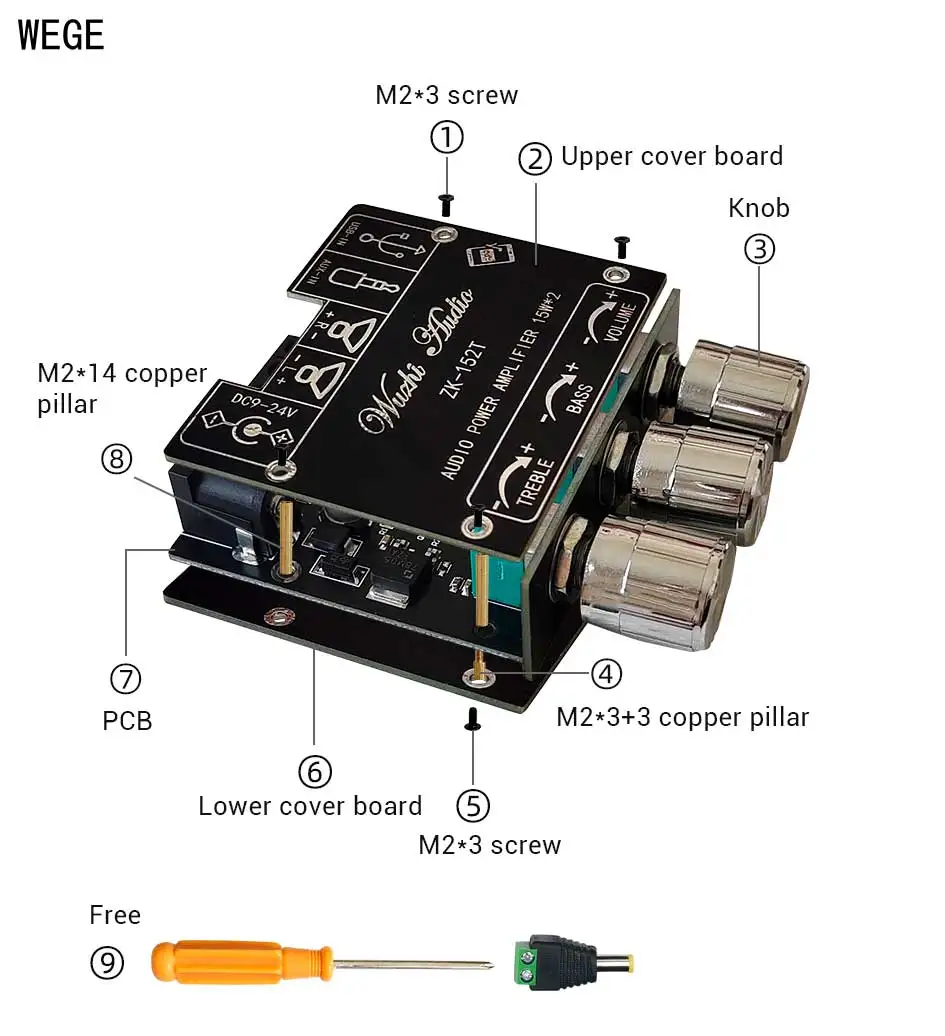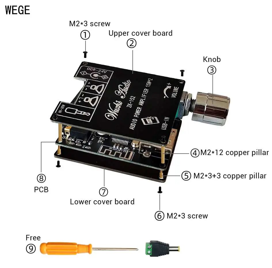 Note: it is recommended to equip with 8Ω speaker and power supply of 9-24V DC. Overpressure is not allowed.