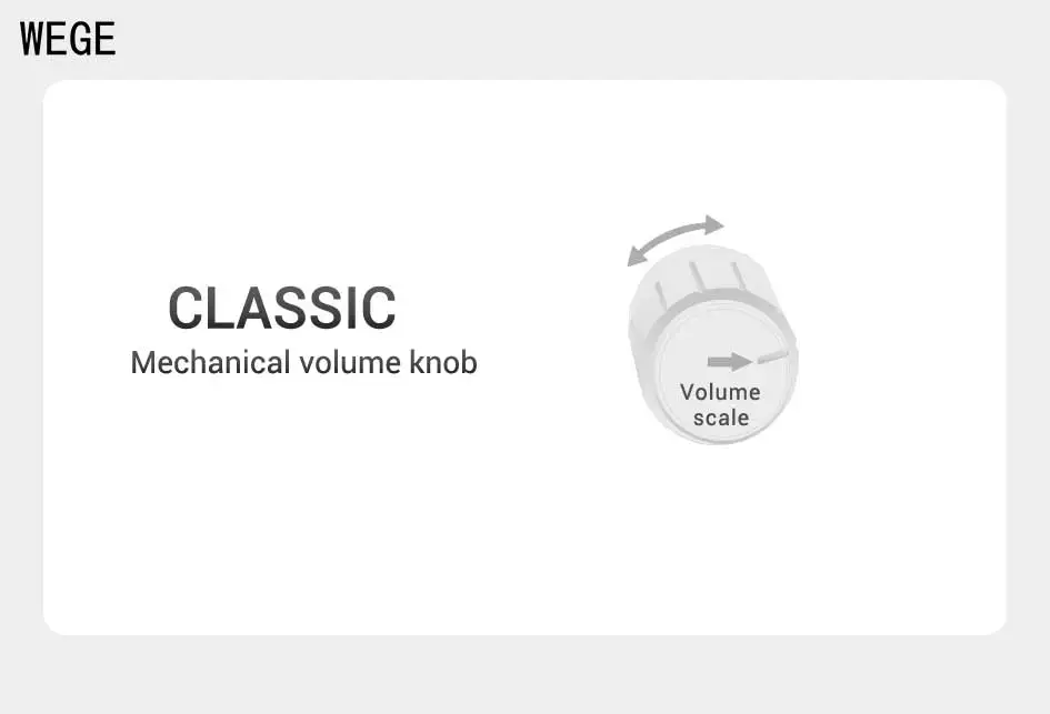 Volume Adjustment: Classic mechanical knob (with volume scale), stepless adjustment