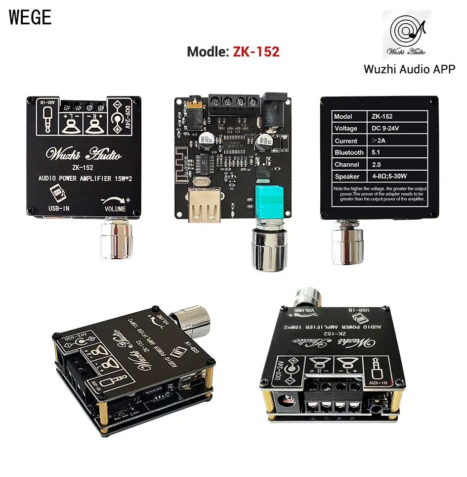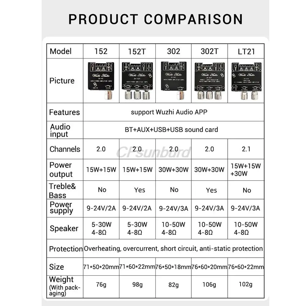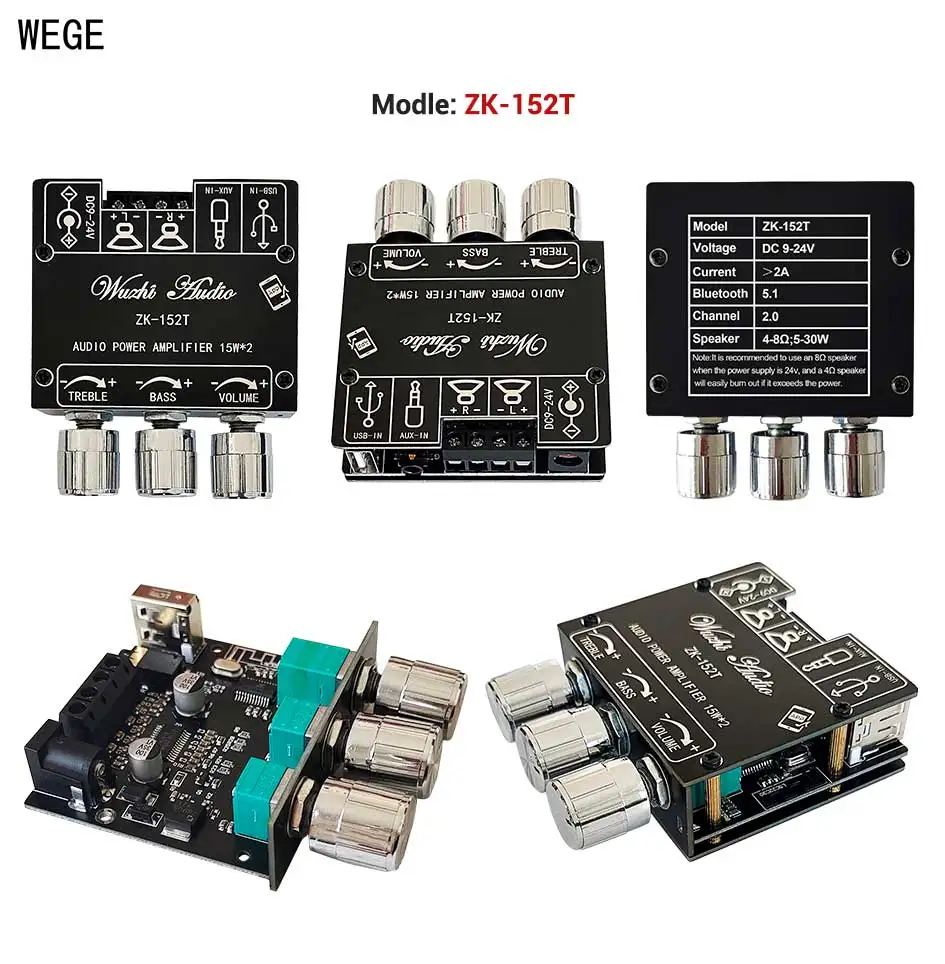 ZK-152, ZK-152T, ZK-302, ZK-302T, the four products are 2.0 channel BT digital power amplifier module. ZK-LT21 is 2.1 channel BT audio digital power amplifier board module.