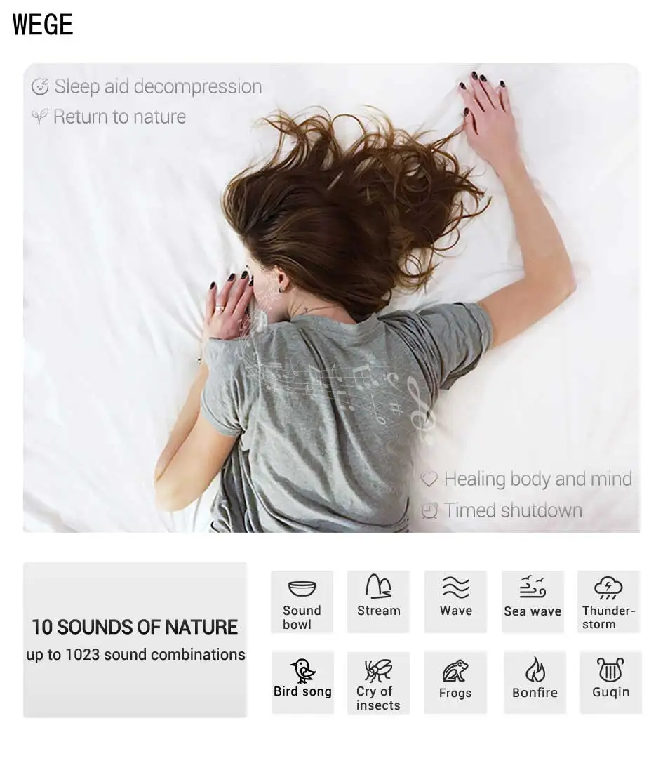 10 natural sounds are Sound bowl, Stream, Wave, Sea wave, Thunderstorm, Bird song, Cry of insects, Frogs, Bonfire, Guqin, up to 1023 sound combinations.