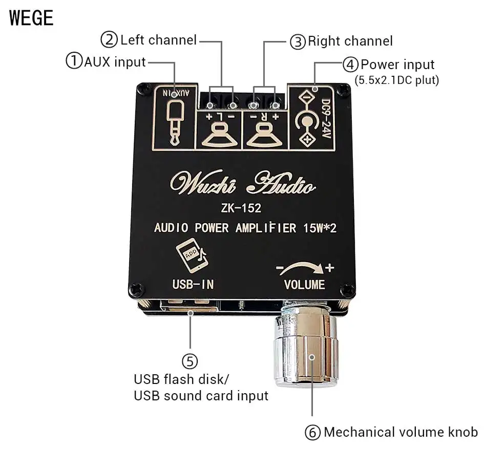 ZK-152T is 15W + 15W stereo output with treble and bass adjustment.