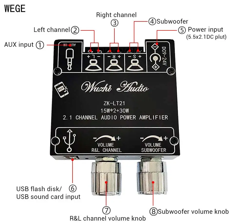 ZK-LT21 is 15W+15W+30W output with Subwoofer.