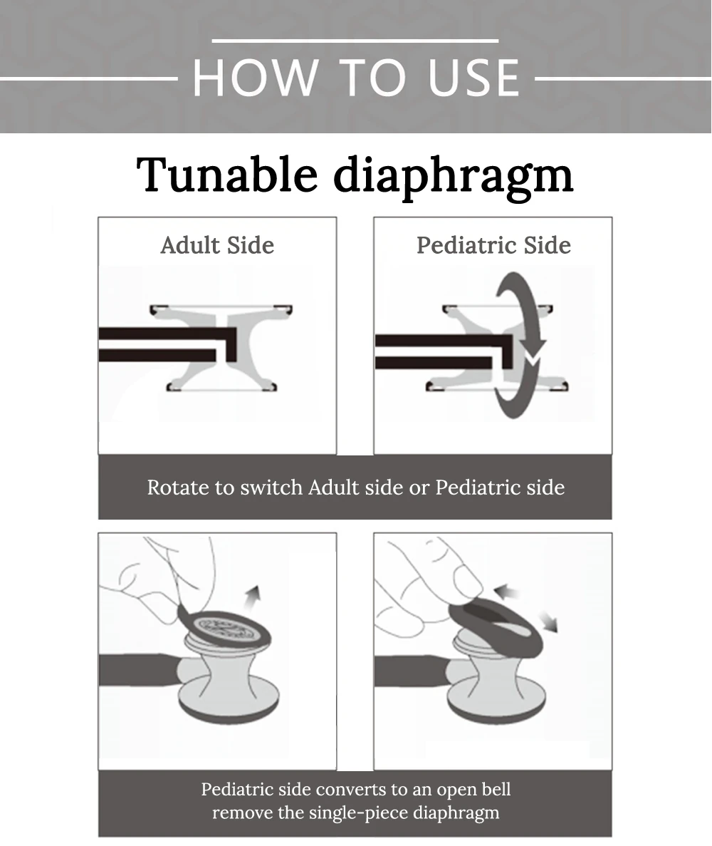 Quando si utilizza una doppia faccia stetoscopio, è necessario per aprire (o indice) sul lato che si desidera utilizzare-Adulto laterale o Pediatrico side-by ruotando la testina. Se il lato Per Gli Adulti è aperto, il Pediatrica lato sarà chiuso, prevenire suono di venire in attraverso il lato Pediatrica, e vice versa. Anche in Età Pediatrica lato può converte un open campana rimuovendo il singolo pezzo del diaframma.