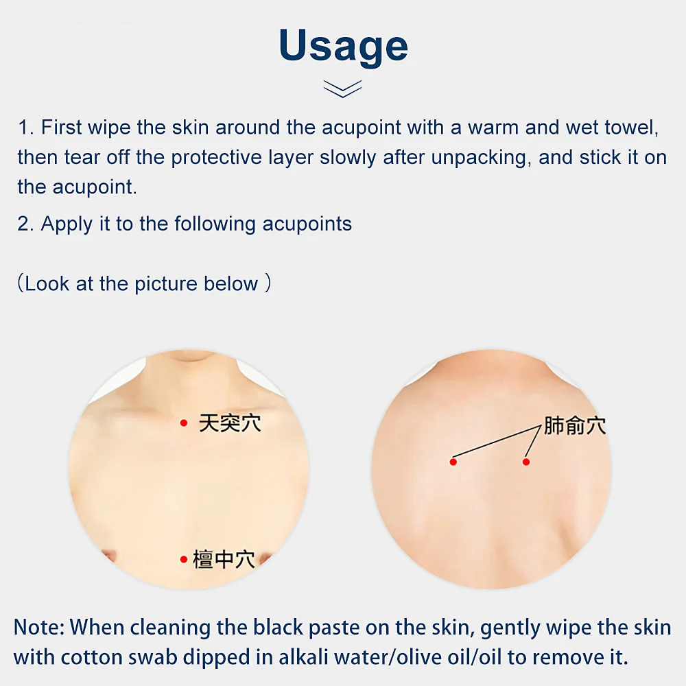 【Instruction per use】 Aprire la confezione, rimuovere la protezione strato, pulire la superficie della pelle e incolla il prodotto sui punti terapeutici, un incollare un giorno per giorni come un corso di trattamento. 【Consumer Promemoria: 】 Si prega di leggere attentamente le istruzioni del prodotto, tabù contenuti, precauzioni e altri contenuti o acquistare e utilizzare il prodotto sotto la guida di personale medico, e posizionare il prodotto in un luogo fuori dalla portata dei bambini. 【Applicable symptoms】 Bronchite cronica, Eccessiva flemma e disagio, Asma