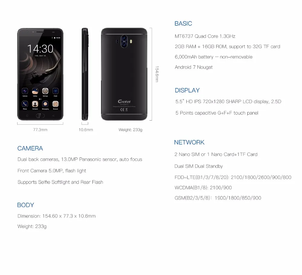 | CPU | MT6737 Quad Core 1.3 GHz |