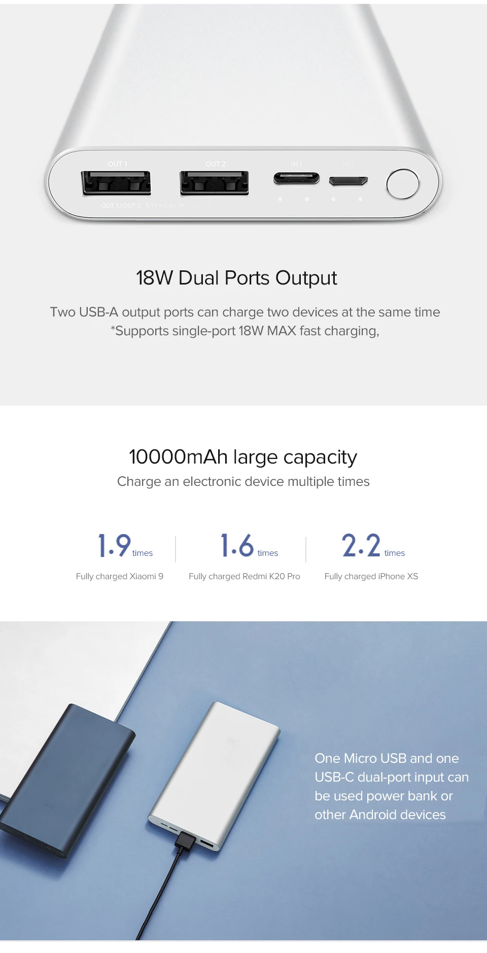 1.USB-C Двусторонняя Быстрая зарядка Два usb-порта, которые могут заряжать устройства одновременно, USB-C и микро-usb обеспечивают два способа зарядки, удобно и быстро. 2. Двойной вход, двойной выход Вход Micro-A и Type-C, выходной буксирный USB-A и обеспечивает более эффективную зарядку. 3. Литий-полимерные батареи высокой плотности. Принимает Премиум литий-полимерные батареи. Он совместим со смартфонами и планшетами, а также с различными цифровыми камерами и портативными игровыми устройствами. Большая емкость 4,10000 мАч Более прочный и оптимизирует эффективность зарядки, обеспечивает постоянную мощность.
