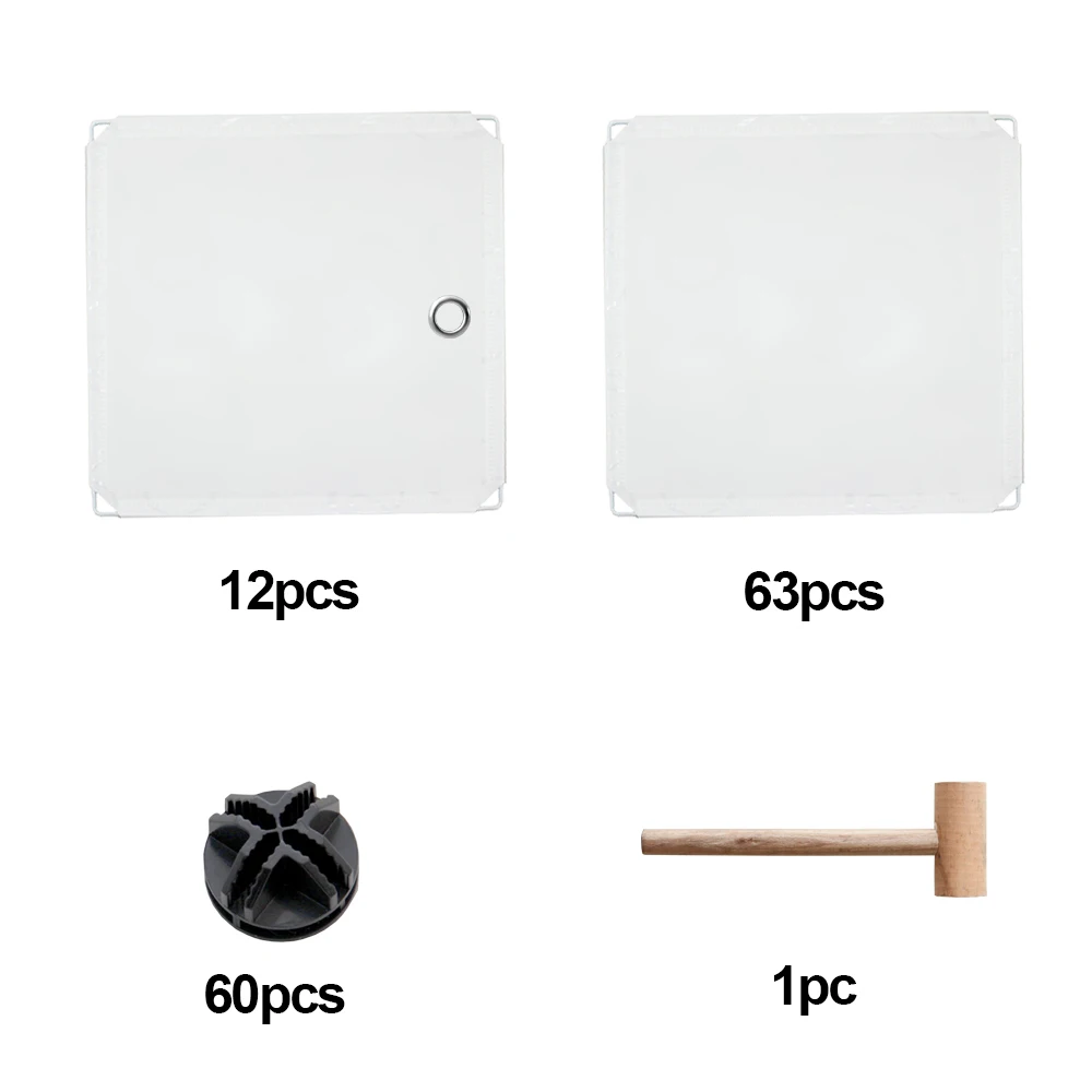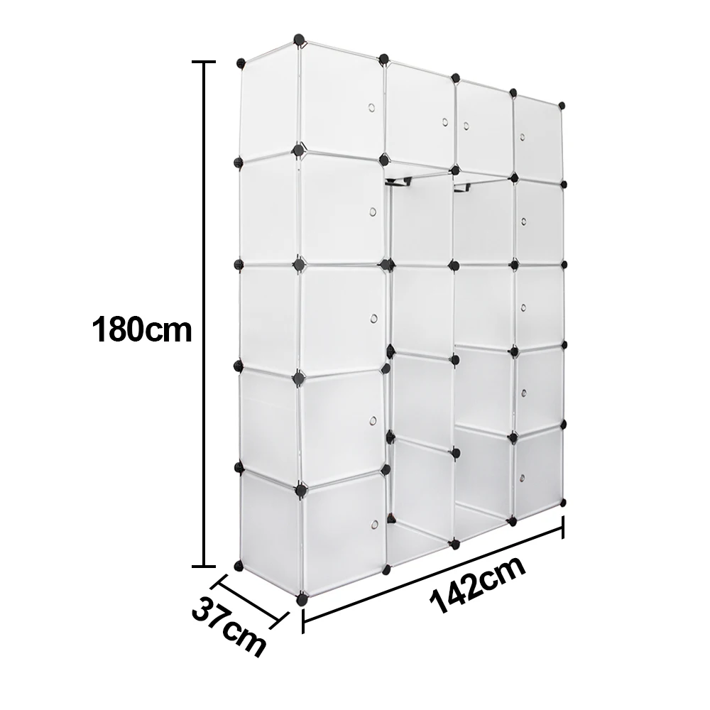 -63 x PP แผ่น (35x35 ซม.,กึ่งโปร่งใสสีขาว) -12 x ประตู (35x35 ซม.,กึ่งโปร่งใสสีขาว) -60 x พลาสติก (สีดำ) -2 x เสื้อผ้า rail (สีขาว) -1 x mallet -คู่มือการใช้งาน 1 x