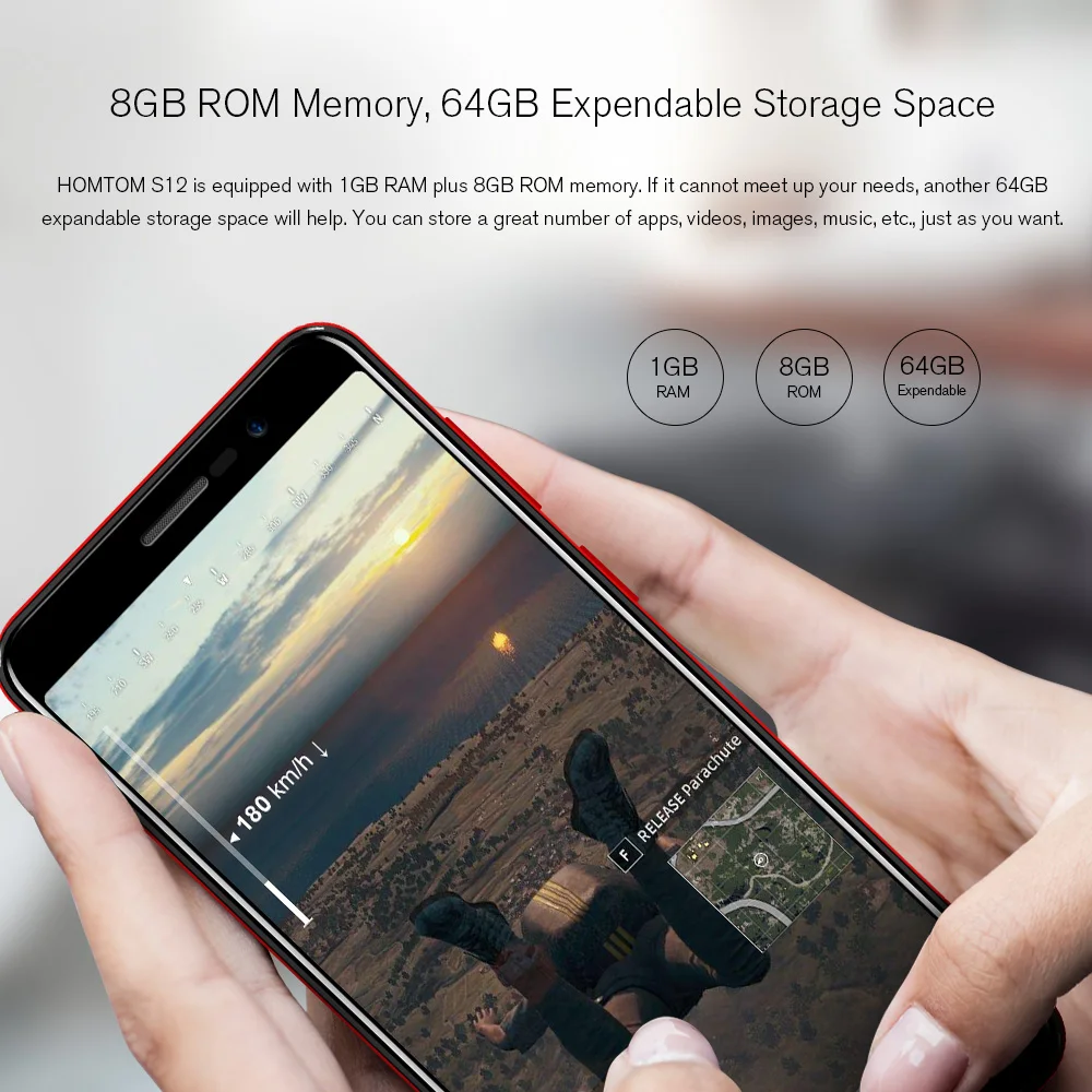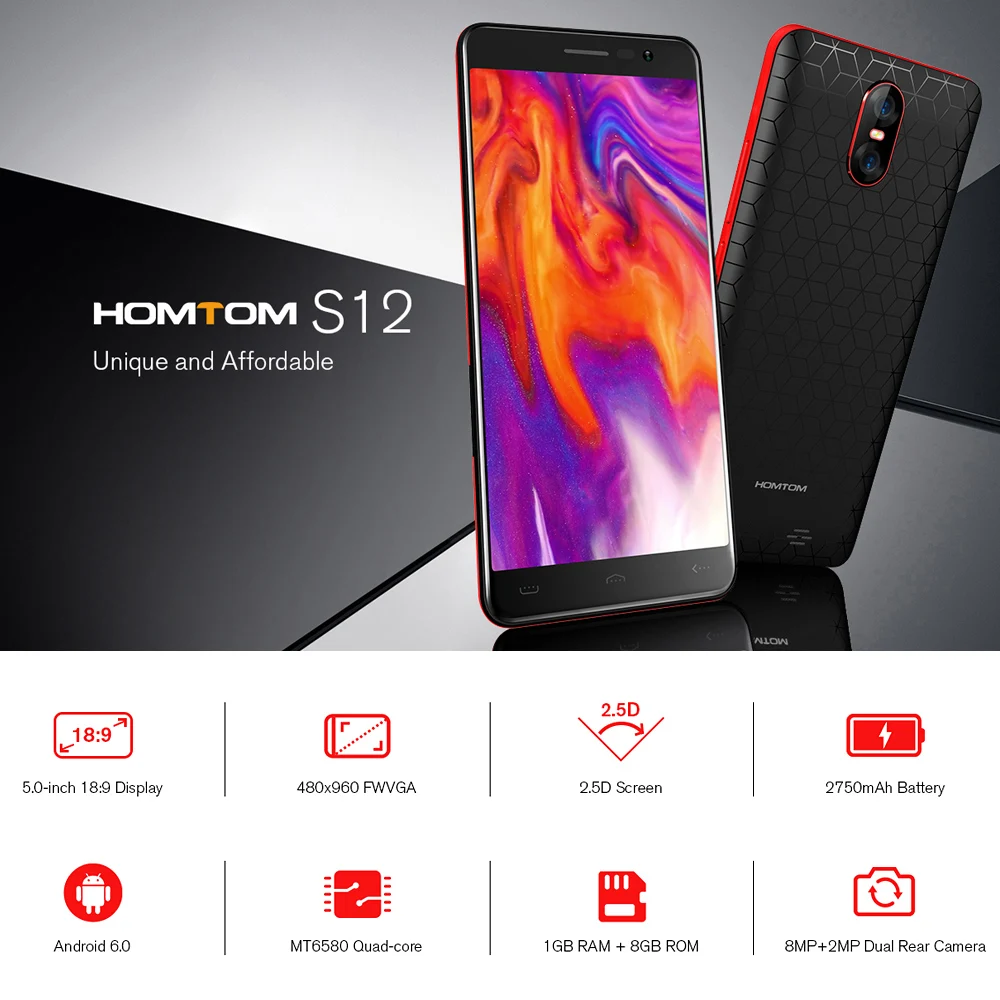 HOMTOM S12 3G WCDMA 900/2100, 2G GSM 850/900/1800/1900, neredeyse tam küresel kapsama destekler. 2750 mAh yüksek kapasiteli, uzun dayanıklılık. WiFi, çoklu uygulamalar, kitap, mesajlaşma, duvar kağıtları, takvim, hesap makinesi, saat, vb.
