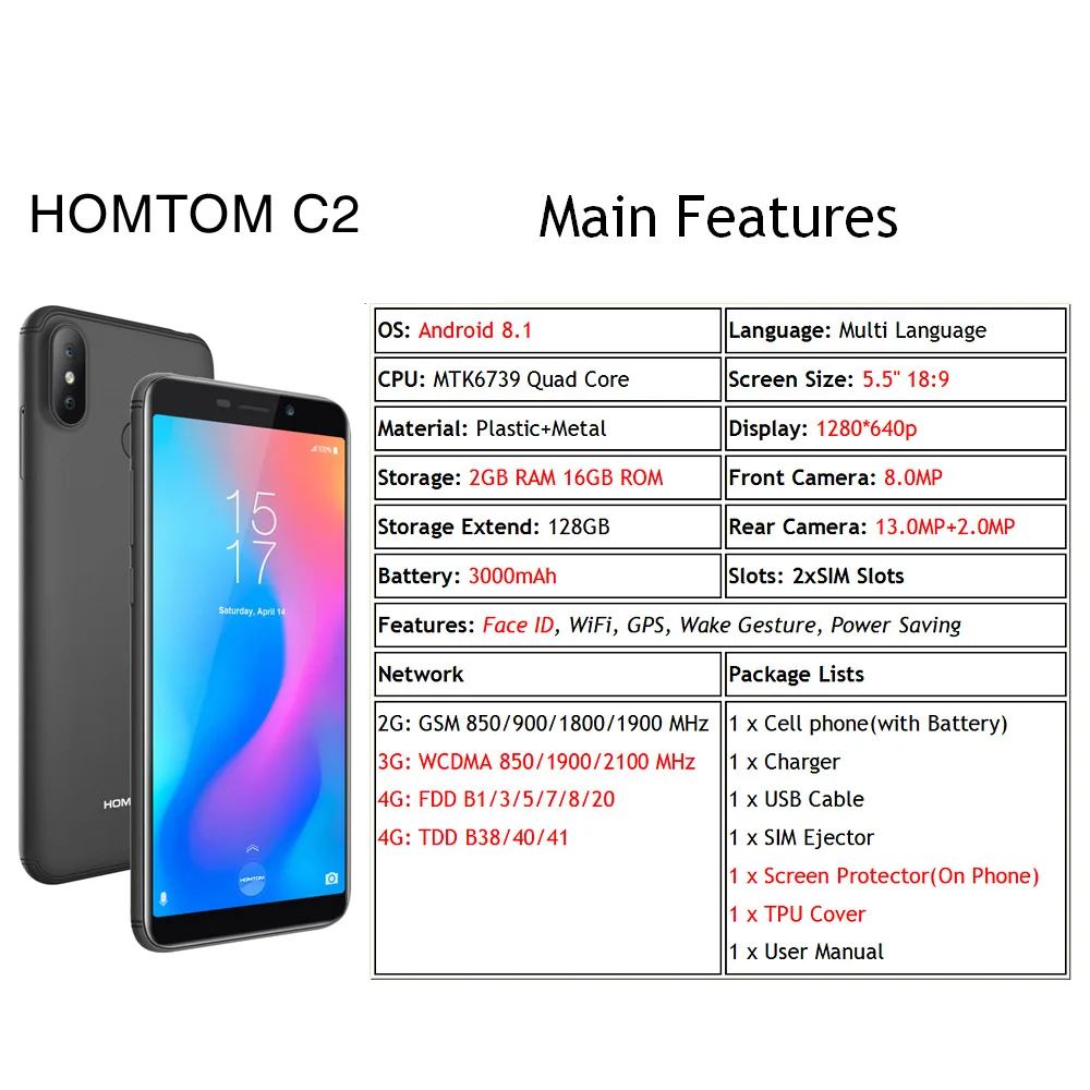 | Paket içeriği | 1 xHOMTOM C2Akıllı telefon |