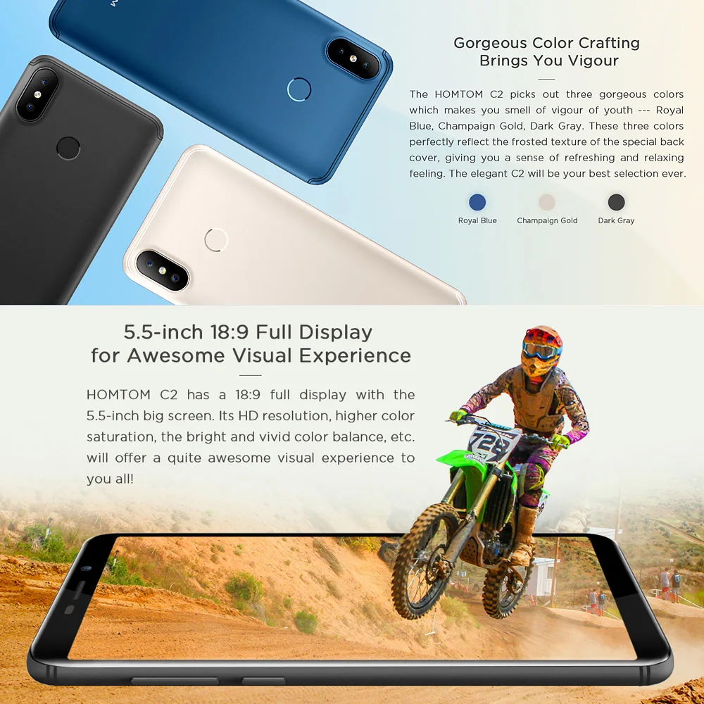 HOMTOM C2, şimdi biraz kompakt olarak kabul edilebilen 18:9 en boy oranını veren bir 5.5 & Prime; 18:9 HD + ekran ile birlikte gelir. HD çözünürlüğü, daha yüksek renk doygunluğu, parlak ve canlı renk dengesi vb. Ile daha büyük ekran, hepinize oldukça harika bir görsel deneyim sunacak.